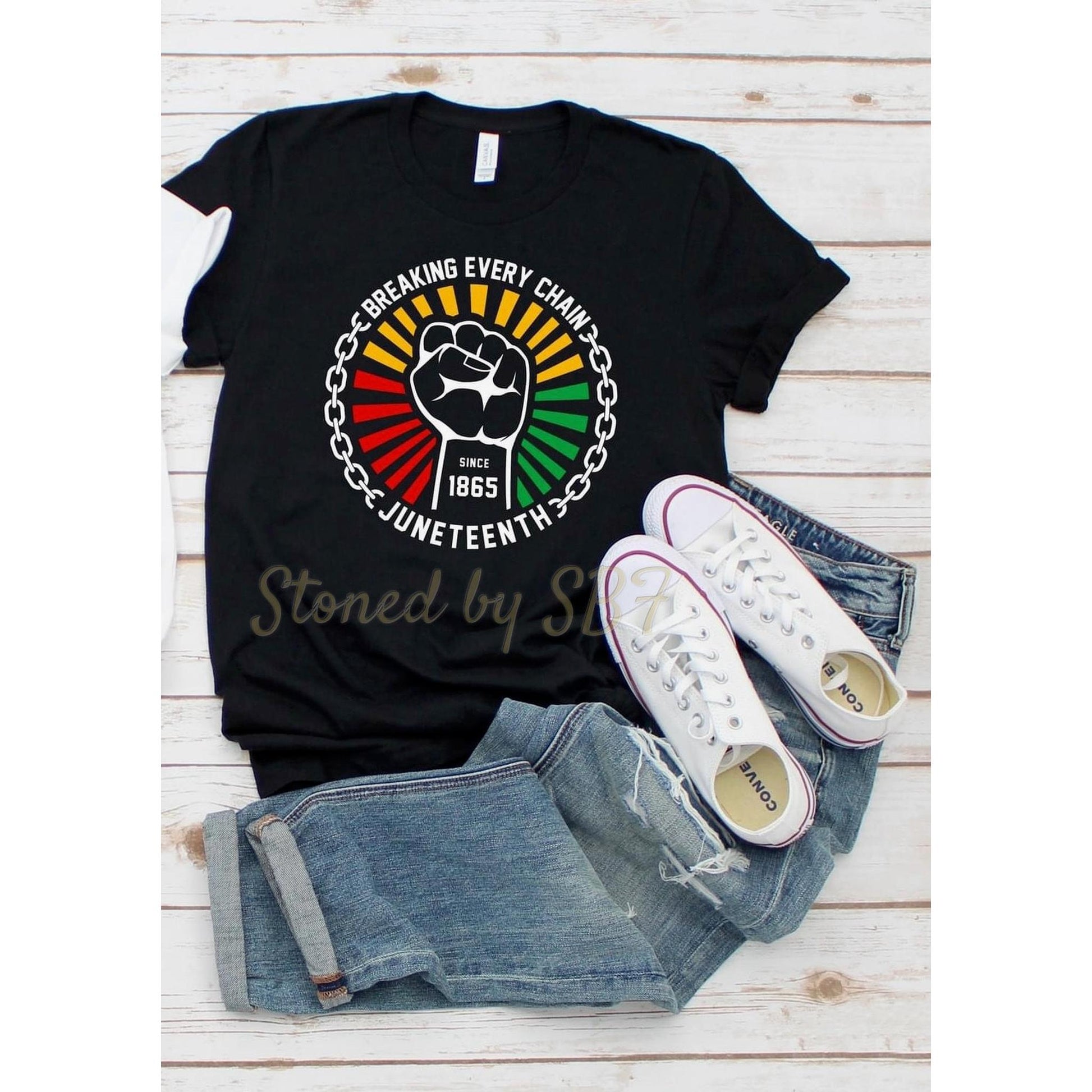 This Breaking Every Chain Juneteenth product features a unique design that celebrates the spirit of Juneteenth. With a captivating graphic representing the breaking of chains, this product holds a powerful message of freedom and unity. Perfect for commemorating the historic day and showing your support for the movement. Make it your own by customizing your shirt style, color, and size.