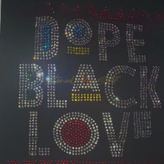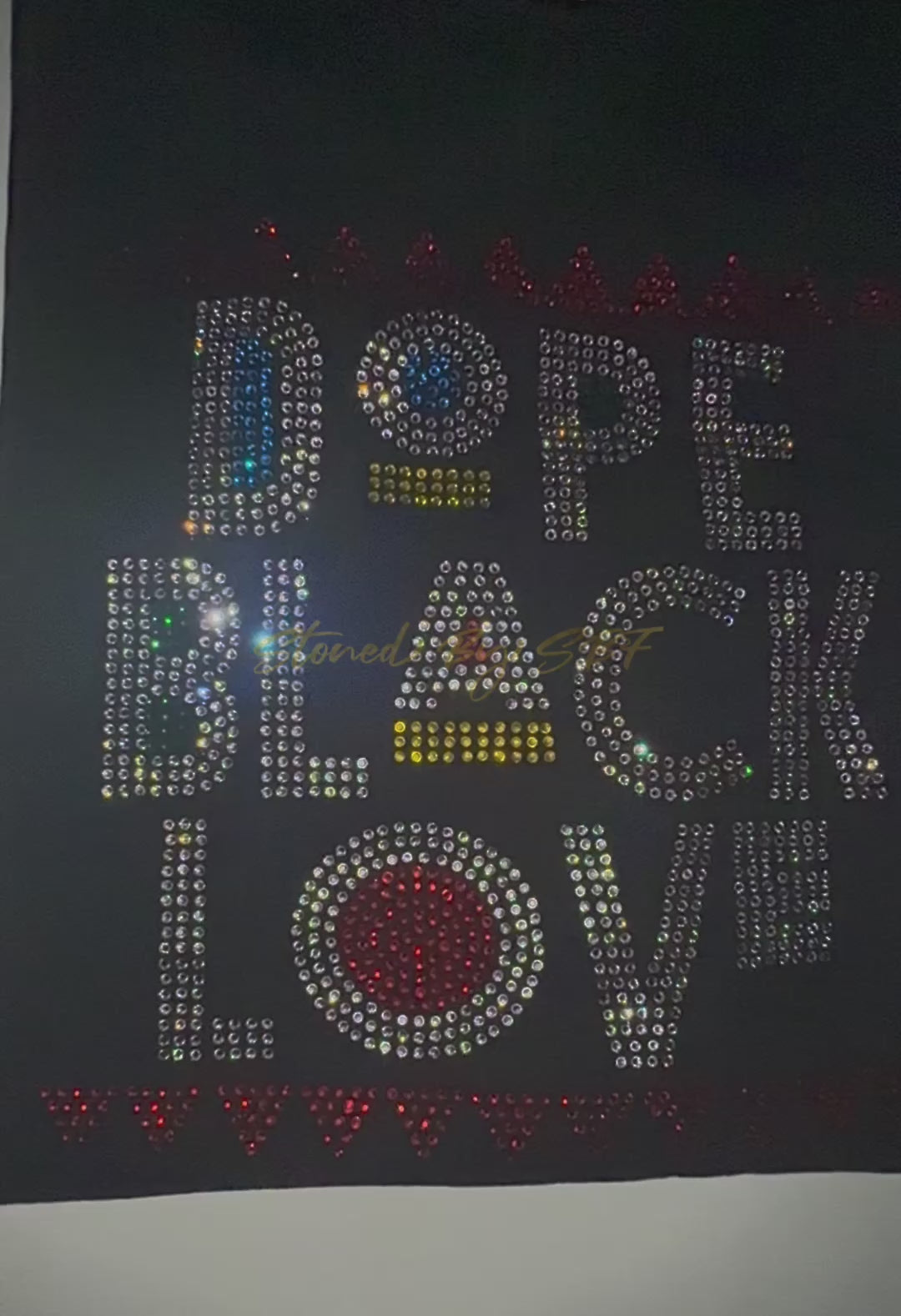 π Design Details: In the featured image, rhinestone color option #1 is siam (red), option #2 is sapphire, option #3 is citrine, and option #4 is emerald. The words "Dope Black Love" sparkle in crystal rhinestones for maximum impact.