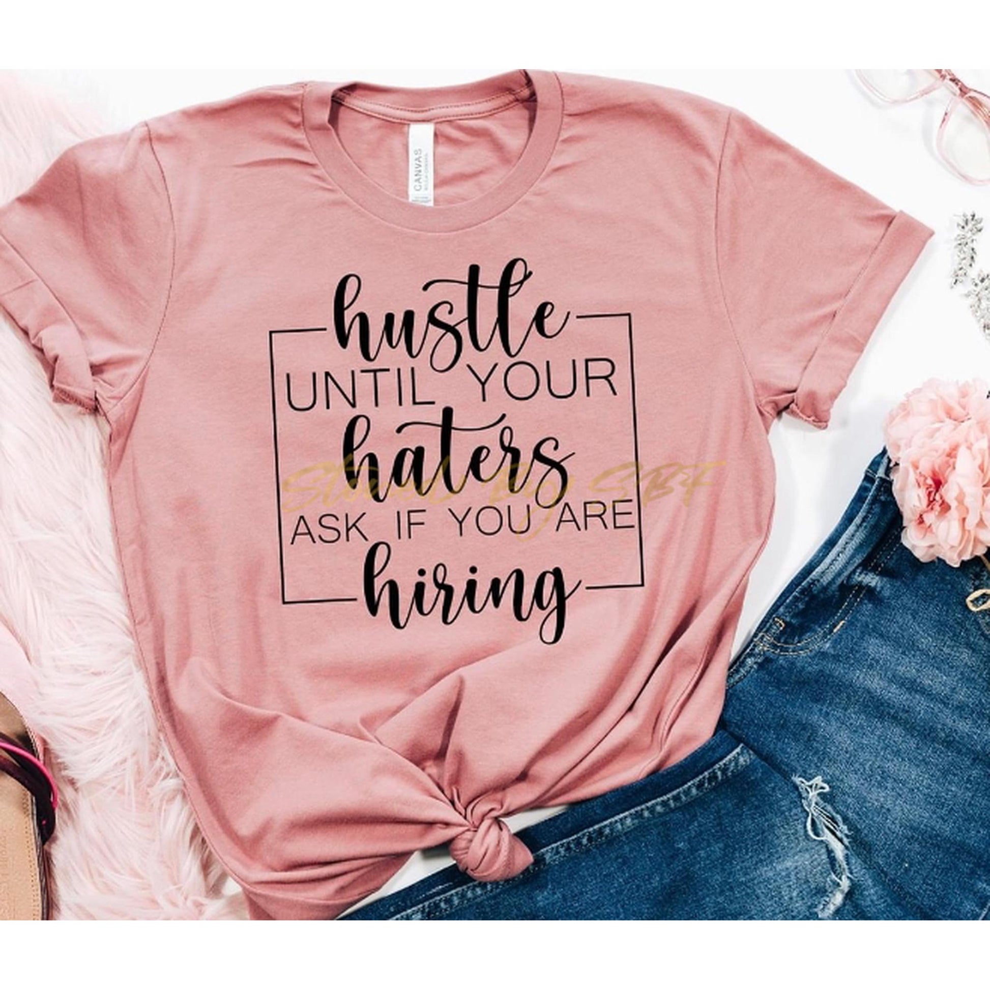 Hustle Until Your Haters Ask If You Are Hiring screen print transfer design. Make it your own by customizing your shirt style, color, size, and the color of the design.