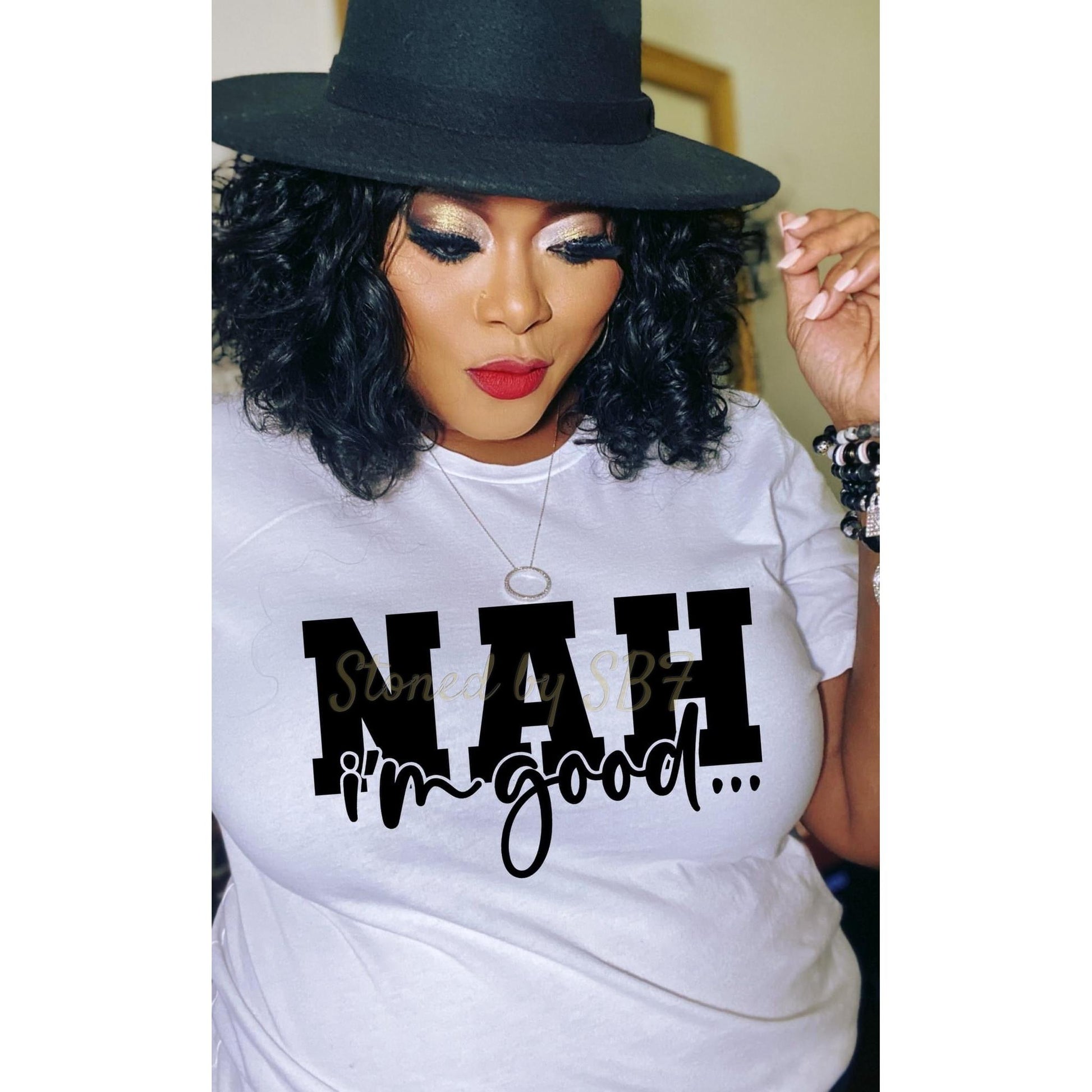 "Nah, I'm Good" screen print transfer design. Make it your own by customizing your shirt style, color, size, and the color of the design.