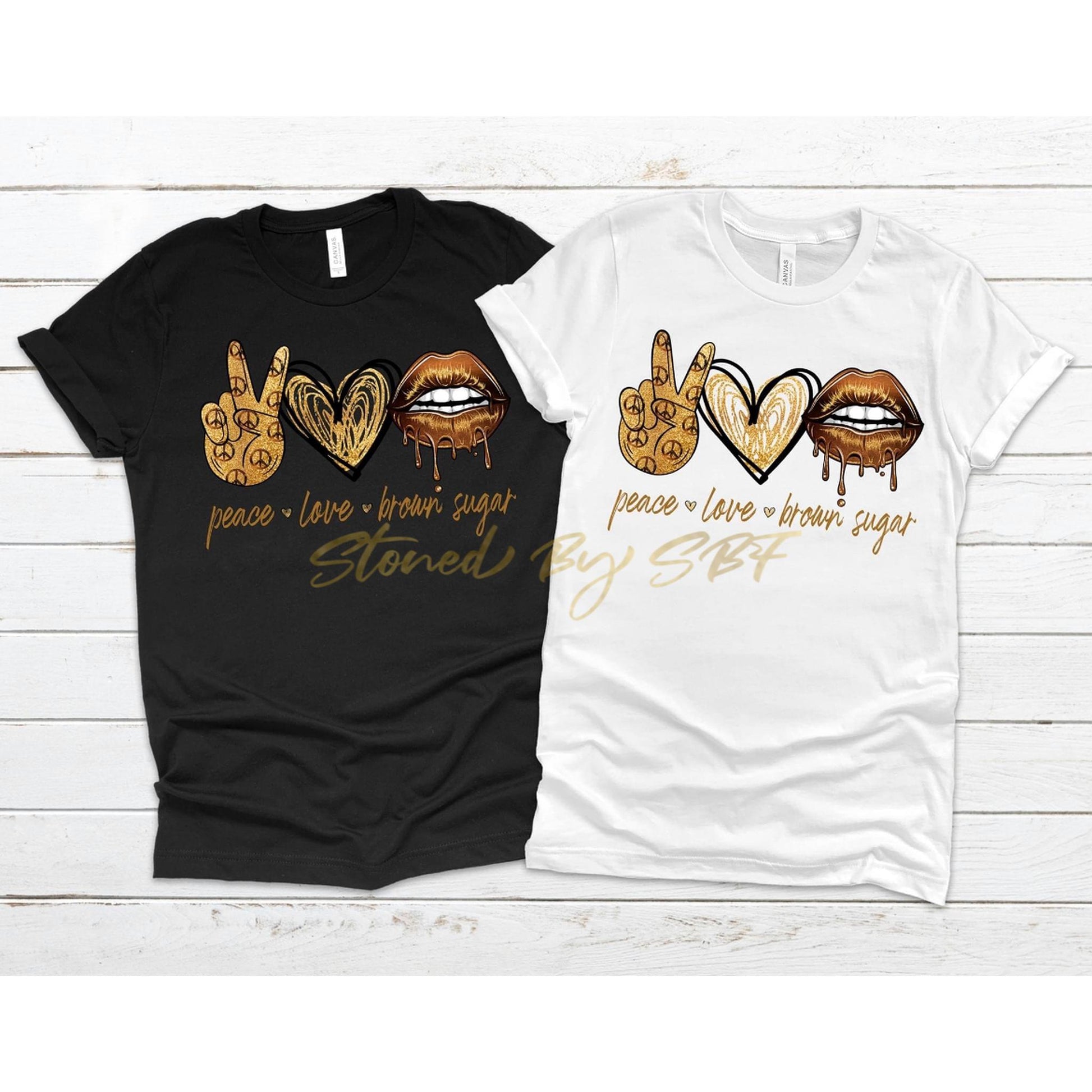Peace Love Brown Sugar screen print transfer design. Make it your own by customizing your shirt style, color, and size.