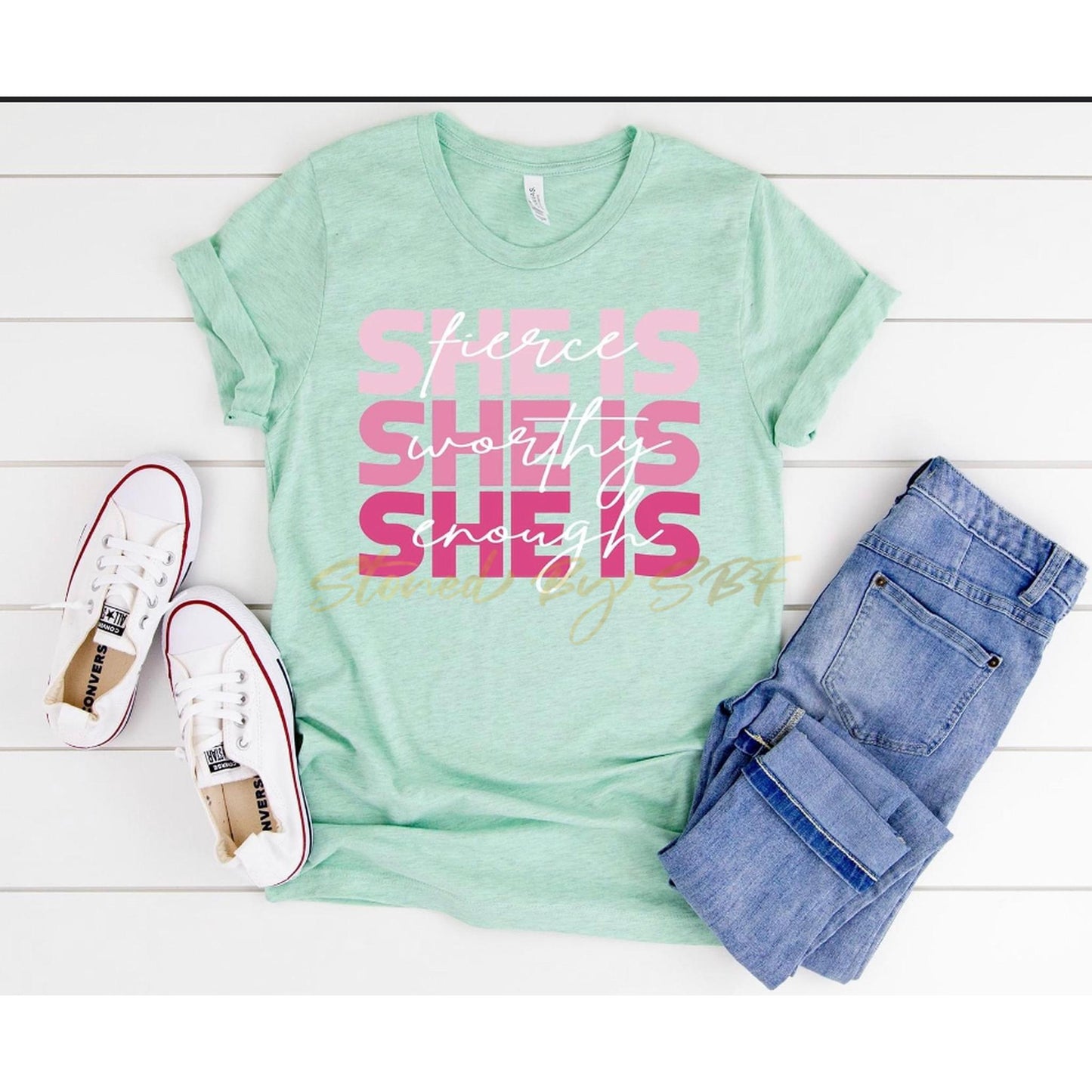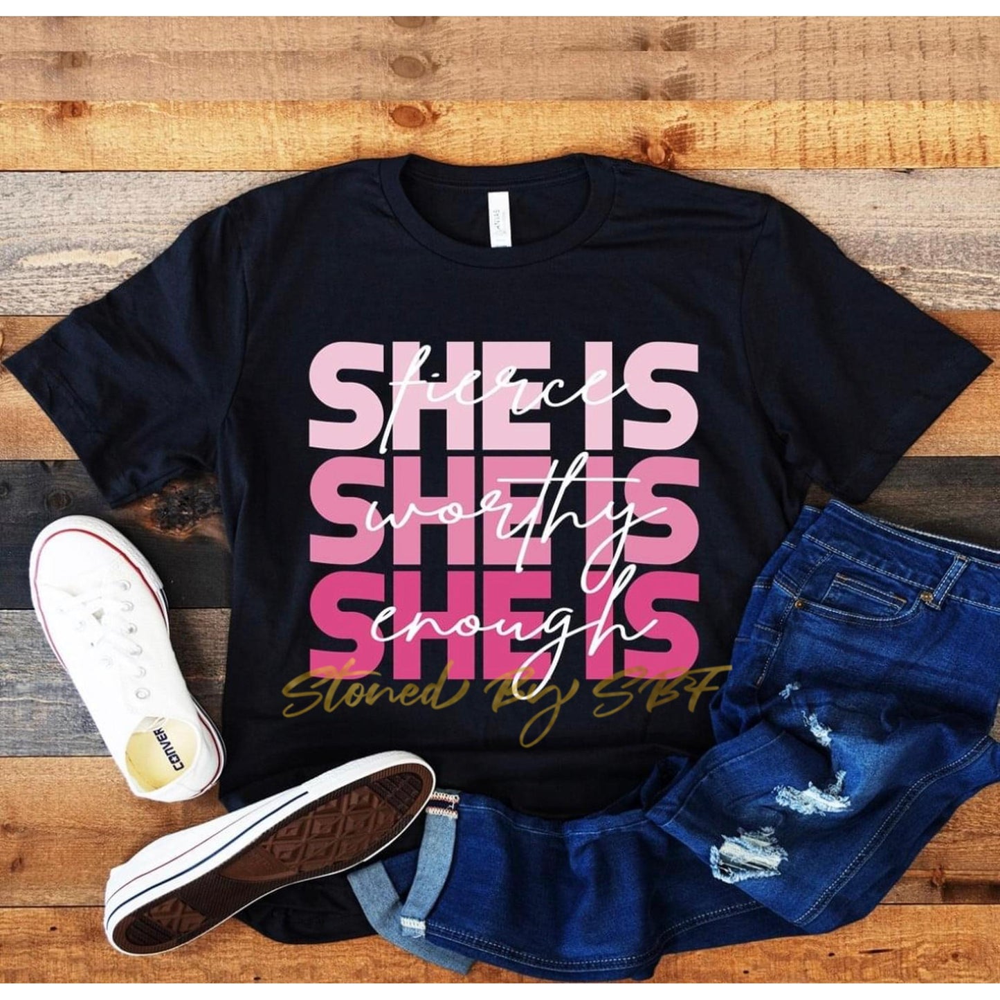 She Is 2 screen print transfer design. Make it your own by customizing your shirt style, color, and size.